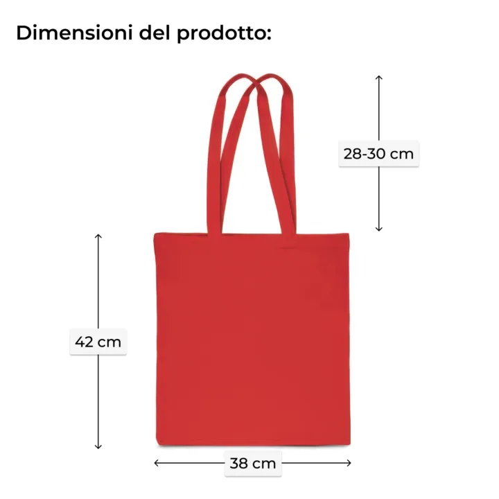 Borsa in cotone rossa di grandi dimensioni 38 x 42 cm in tessuto di cotone di grammatura 140 g. Questa borsa ecologica possiede dei comodi manici lunghi. Le nostre borse in cotone sono confezionate singolarmente, la presente offerta riguarda 1 pezzo.