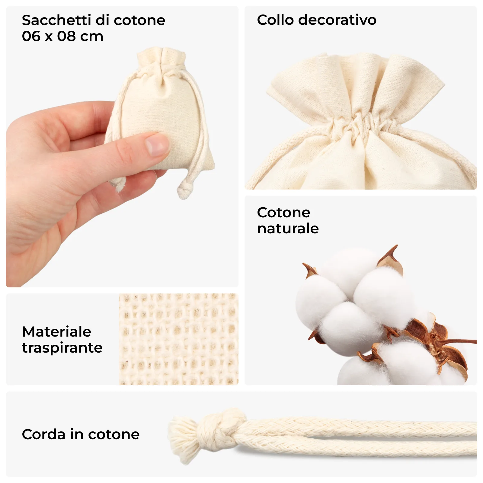 I sacchetti sono realizzati in cotone naturale, un materiale resistente ed ecologico.
