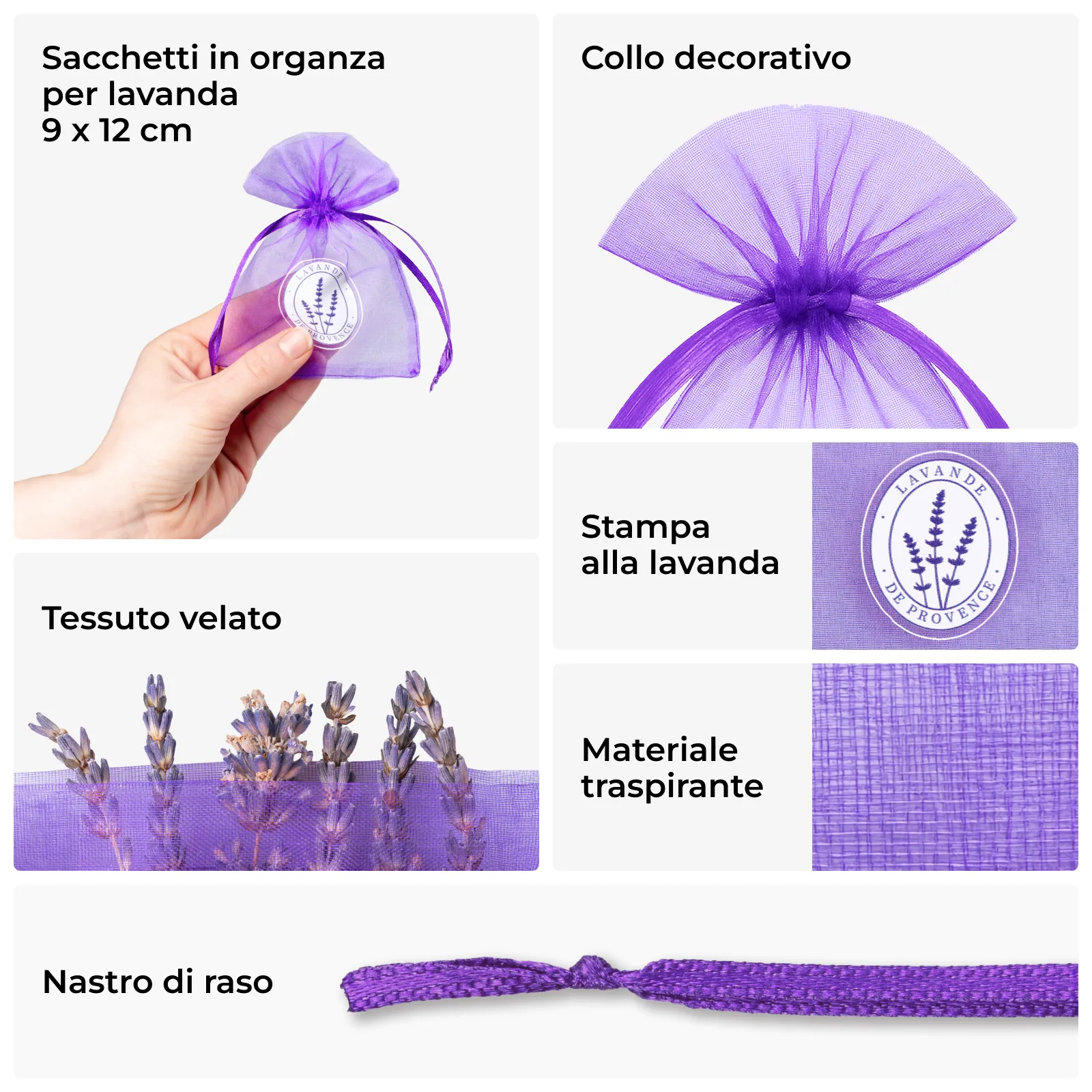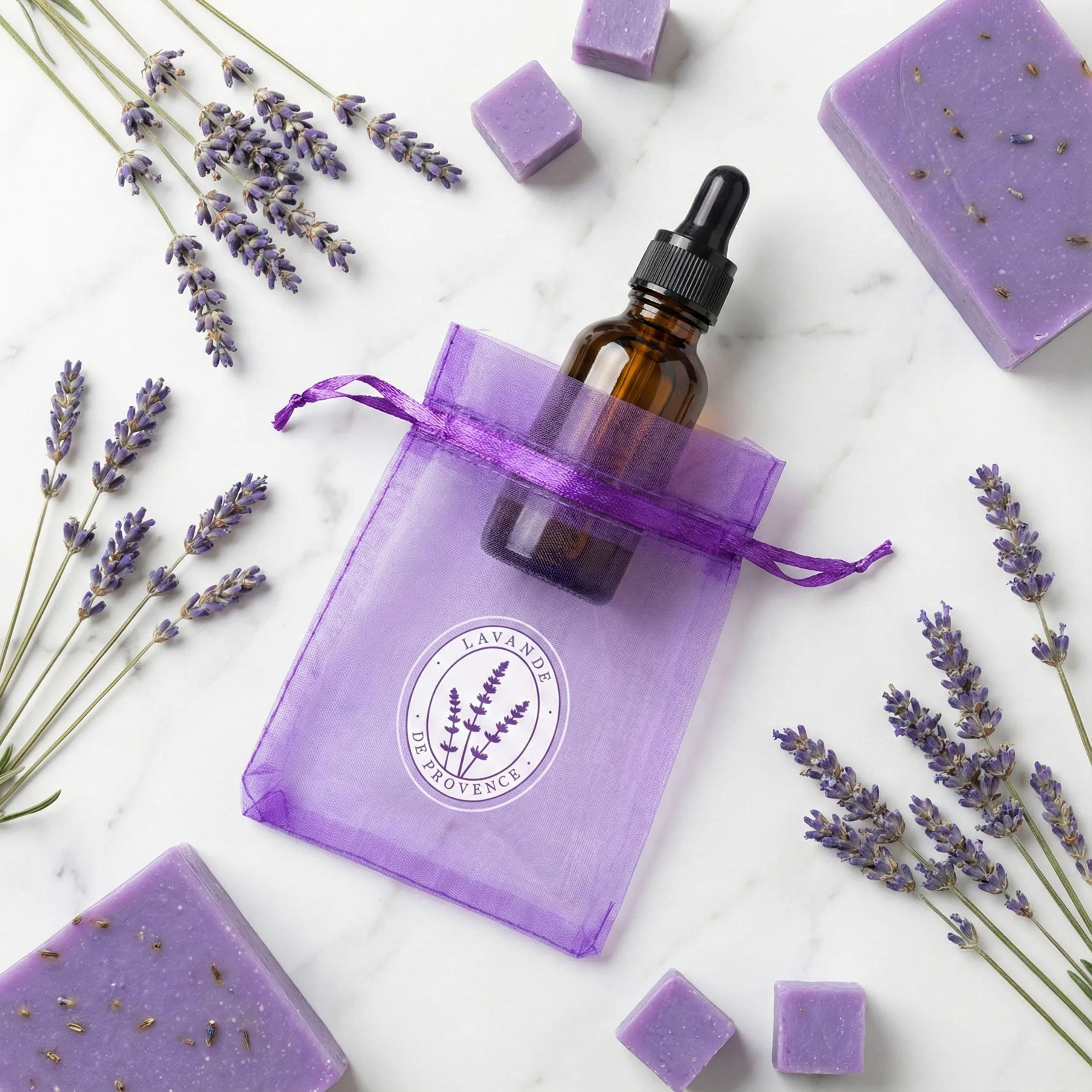 I sacchetti organza lavanda 9 x 12 cm sono piccoli sacchetti decorativi in tessuto leggero, ideali per chi cerca sacchetti regalo lilla, confezioni per lavanda secca, campioni cosmetici o sacchetti gioielli 9 x 12. Il set comprende 10 sacchetti viola scuro con stampa "Lavande de Provence" e chiusura con doppio nastro di raso.