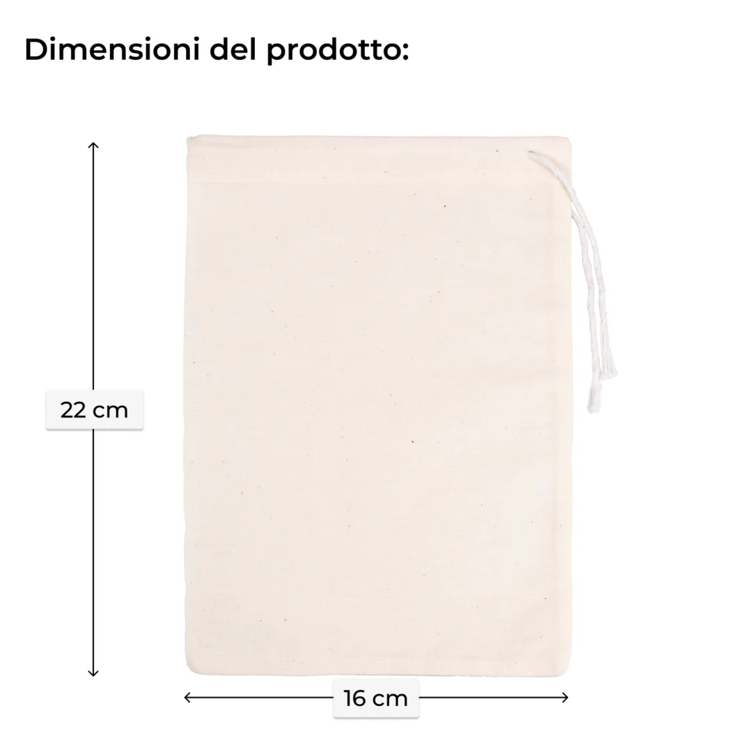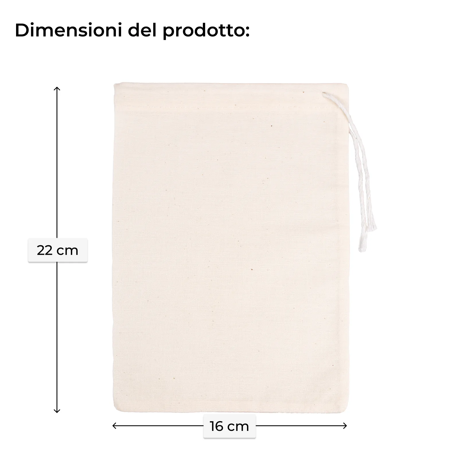 Ogni sacchetto misura 16 × 22 cm e una confezione contiene 5 sacchetti in cotone.