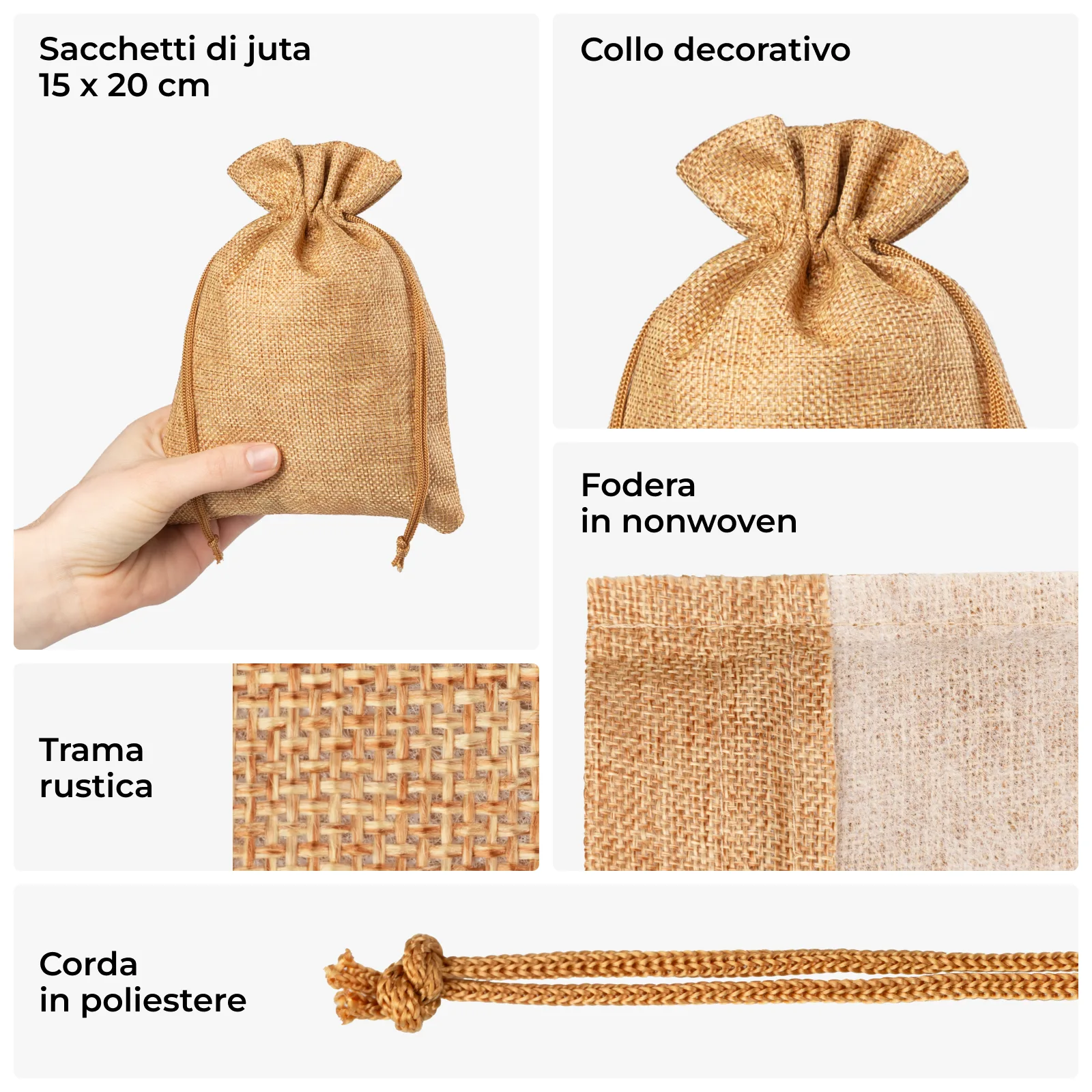 5 pezzi di sacchetti di iuta nel colore marrone chiaro di dimensioni 15 cm x 20 cm.