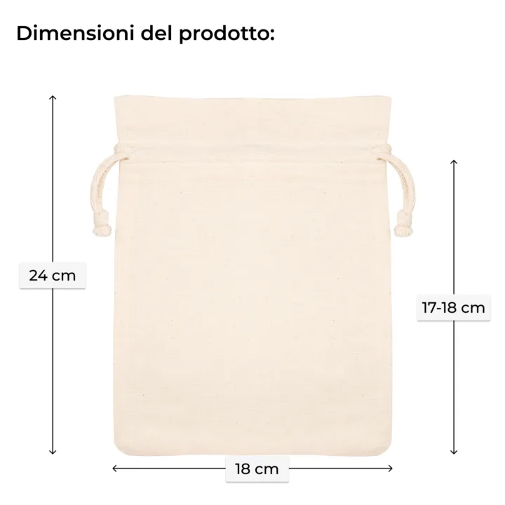 Durevole e pratico sacchetto di cotone di dimensioni 18 x 24 cm, legato con un cordino naturale.
