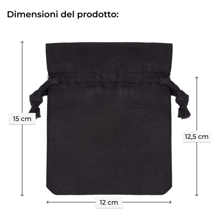 Collezione di 10 pezzi di sacchetti in originale tessuto tipo cotone di dimensioni 12 x 15 cm, il cui colore nero è adatto a quasi ogni situazione. Il set che offriamo è universale poiché consente di utilizzare i sacchetti in molti modi, a seconda della situazione.
