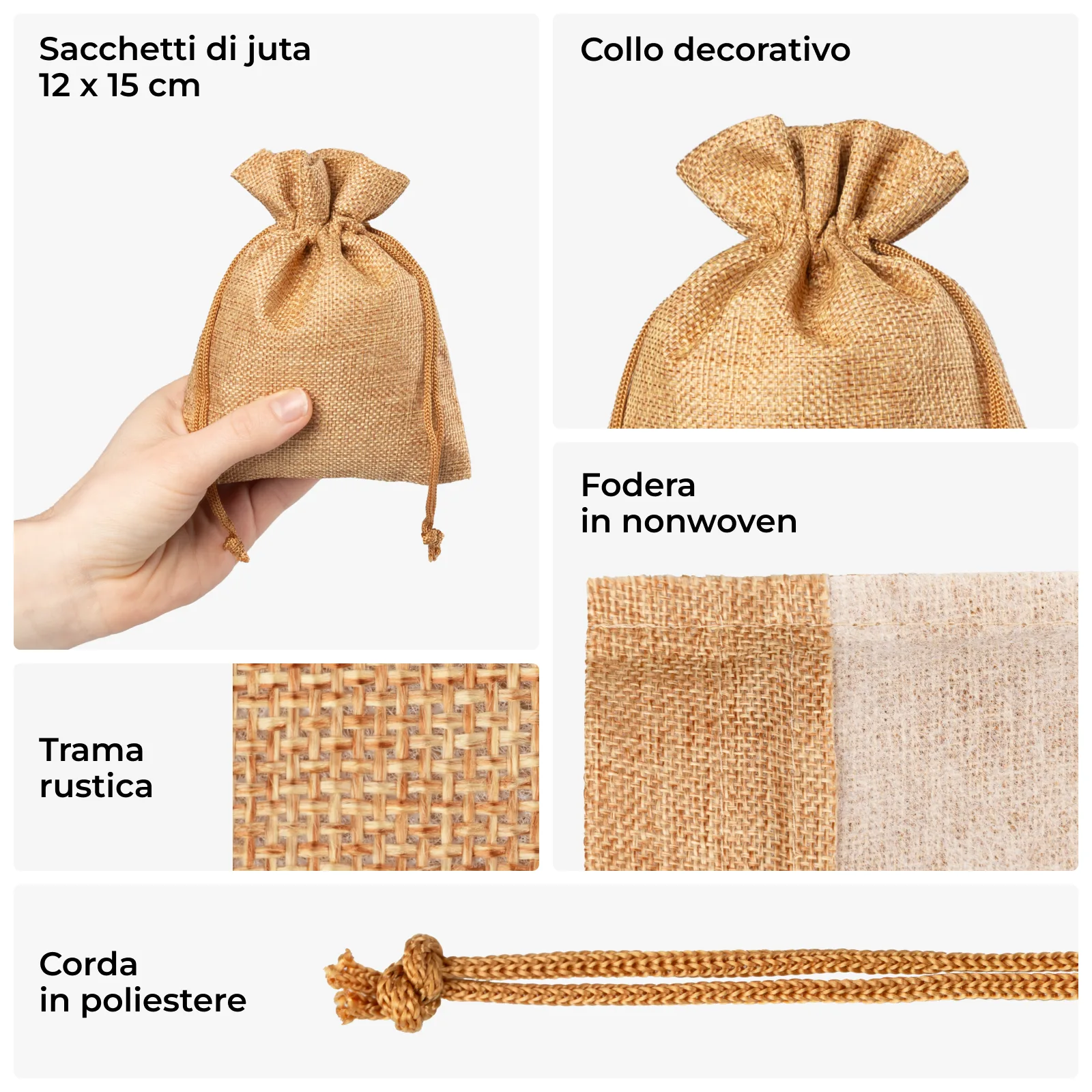 I nostri sacchetti sono realizzati in un tessuto dall'aspetto di iuta, caratterizzato da resistenza e un tipico "aspetto cordato". I sacchetti di tessuto assorbono e rilasciano l'umidità, quindi non temono le mutevoli condizioni ambientali.
