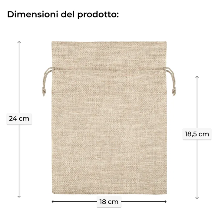 I nostri sacchetti di juta di dimensioni 18 x 24 cm sono imballaggi versatili ed eleganti che si adattano perfettamente a molte applicazioni. Realizzati in juta sintetica, sono ecologici e duraturi, il che li rende la scelta ideale sia per i clienti individuali che per quelli aziendali.