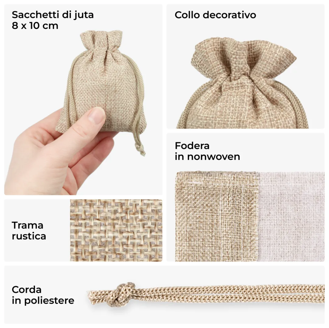 I sacchetti piccoli di iuta, molto versatili ed eleganti, sono disponibili nel colore naturale con dimensioni di 8 cm x 10 cm. Il pacchetto presentato consiste di 10 sacchetti; l’acquisto di una volta può essere sufficiente per un lungo periodo. I sacchetti di iuta della nostra gamma sono realizzati in iuta naturale o sintetica, ma indipendentemente dal tipo di materiale sono caratterizzati da una struttura solida e da un aspetto distintivo, come lo spago intrecciato.