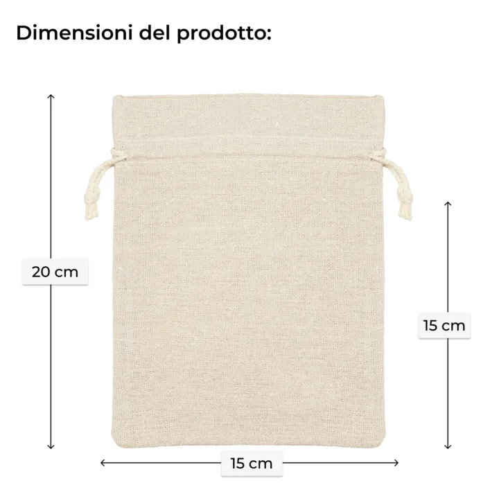 Stai cercando un organizzatore per piccoli oggetti domestici? O forse vuoi creare regali promozionali unici con il logo della tua azienda? In entrambi i casi, la soluzione perfetta sarebbero sacchetti di lino di 15 x 20 cm, che hanno utilizzi versatili. Questi piccoli sacchetti con coulisse sono realizzati in tessuto misto cotone-poliestere di alta qualità che assomiglia molto al lino per quanto riguarda colore, texture e tessitura. La combinazione di fibre naturali e sintetiche rende i nostri sacchetti di lino durevoli, riutilizzabili, e resistenti all'allungamento e all'usura. Il tessuto garantisce un'ottima circolazione dell'aria pur essendo piacevole al tatto.