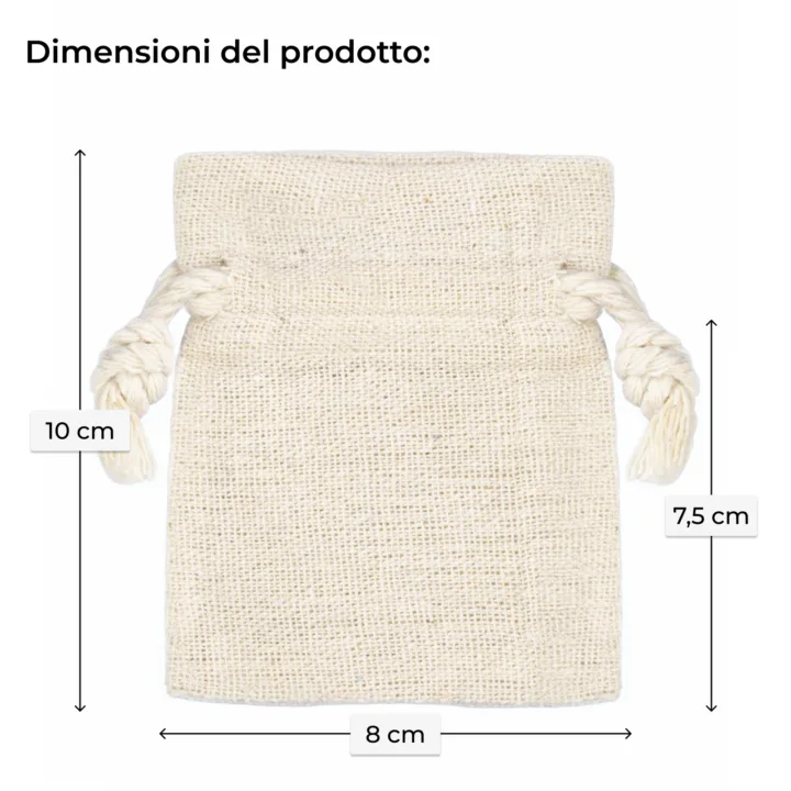 I sacchetti solidi e pratici in tessuto tipo lino con dimensioni 8 x 10 cm sono dotati di un cordoncino in spago naturale. Il materiale dall'aspetto rustico è una scelta classica che unisce estetica e funzionalità.