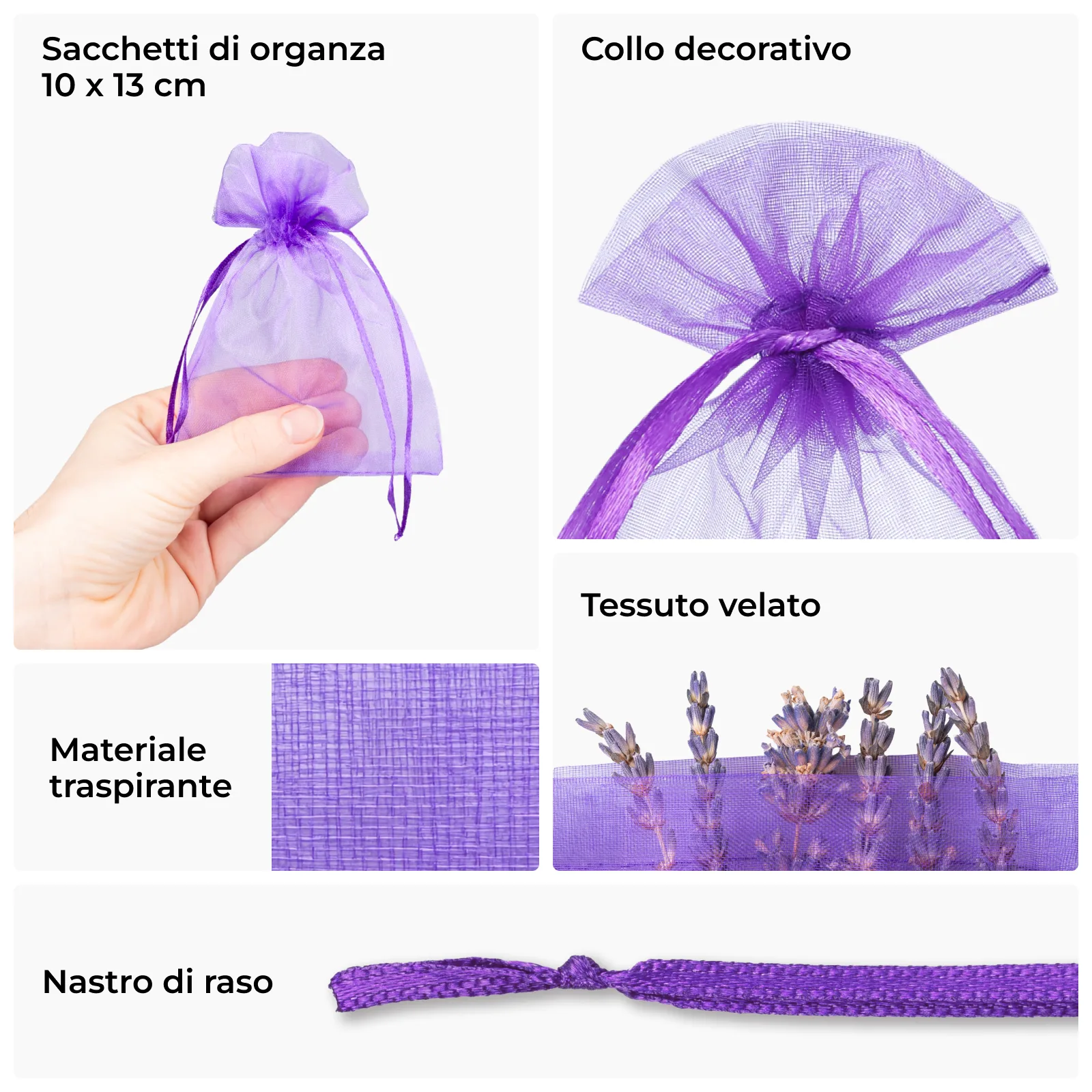 L'organza è un tessuto semitrasparente con una struttura molto luminosa, che non solo ha una presenza elegante, ma è anche contrariamente alle apparenze molto solida. I sacchetti in organza sono quindi il modo pratico per riporre piccoli oggetti per un lungo periodo di tempo.