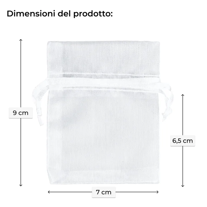 Il set pratico di piccoli sacchetti di organza con dimensioni 7 cm x 9 cm. Il pacchetto include 25 sacchetti in colore bianco, fornendo così tanto spazio per i piccoli oggetti. Possiamo anche fare sacchetti con la stampigliatura aggiungendo il tuo logo direttamente sul materiale - Basta contattarci.