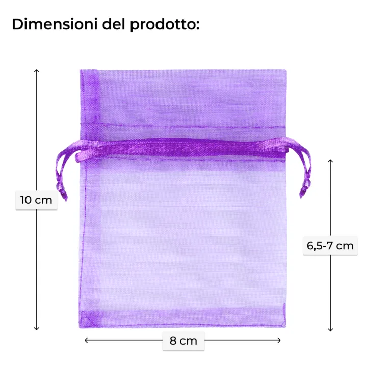 I sacchetti di organza di misura 8 x 10 cm disponibili in colore viola sono un prodotto che combina durevolezza ed eleganza. Grazie alla loro alta qualità, i nostri sacchetti sono resistenti e durevoli, garantendo un uso a lungo termine. Sono perfetti per confezionare regali, conservare gioielli o cosmetici, oltre che per decorazioni nuziali e altre celebrazioni.
