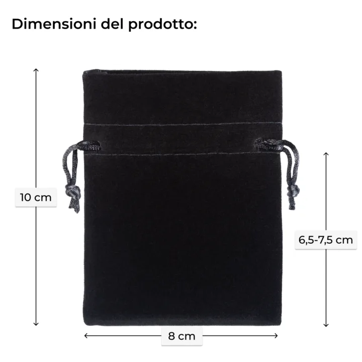 Il velluto è un tessuto morbido con una superficie leggermente lucida che valorizza la presentazione del contenuto. La struttura soffice protegge gli oggetti da piccoli graffi, mentre il colore nero offre un contrasto raffinato per metalli preziosi, pietre o accessori decorativi. Il materiale mantiene la forma e l'aspetto ordinato anche con un uso frequente. La chiusura con doppio cordino facilita l'apertura e la chiusura senza rovinare il contenuto.