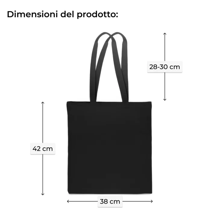 Borsa in cotone nero di grandi dimensioni 38 x 42 cm in tessuto di cotone di grammatura 140 g. Questa borsa ecologica possiede dei comodi manici lunghi. Le nostre borse in cotone sono confezionate singolarmente, la presente offerta riguarda 1 pezzo.