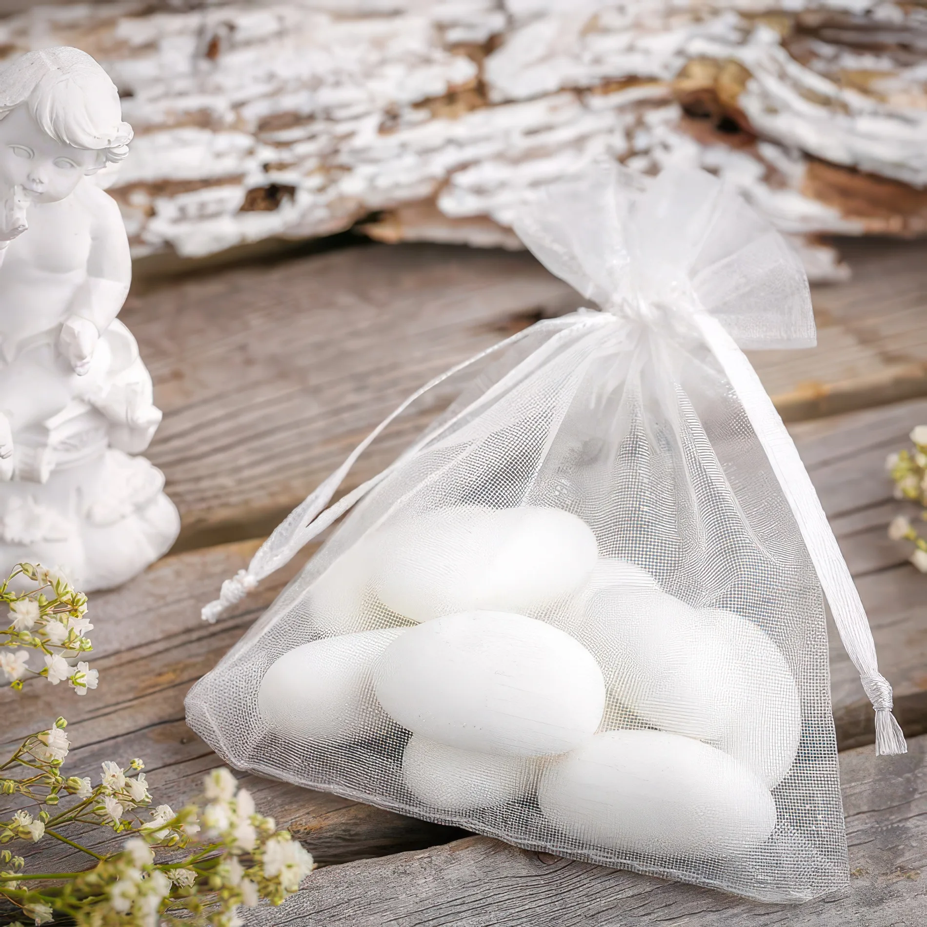 Una serie di piccoli sacchetti di organza di dimensioni 10 cm x 13 cm nel colore bianco. Questo pratico kit contiene 25 sacchetti, in modo che acquisto è sufficiente per un lungo tempo.