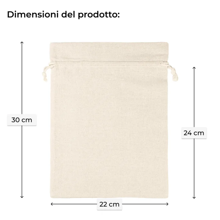 Un ulteriore vantaggio di questo sacco è la coulisse con doppio cordino di cotone dalla trama decorativa, che consente la chiusura semplice e rapida della confezione.